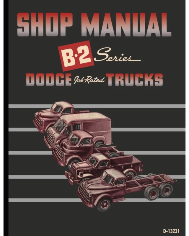 1950 Dodge Truck B-2 Series Shop Manual.\\u00A0beskrivningar hur man servar och reparerar framvagn, bromsar, transmission,styrning, kylsystem, karaftöverföring, motor, AC, avgas med mera. Antal sidor 336 Författare Dodge Division Dodge Truck B-12series\\u00A01950