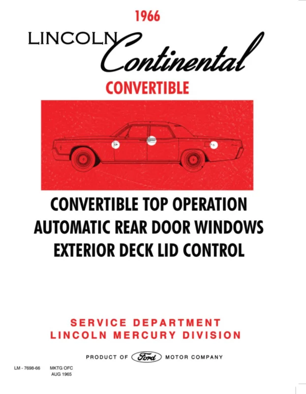 1966 Lincoln Continental Covertible Top Operation, Auto Rear Door Windows, Exterior Deck Lid Control Shop Manual. Malm Motors servicemanualer för USA-bilar.