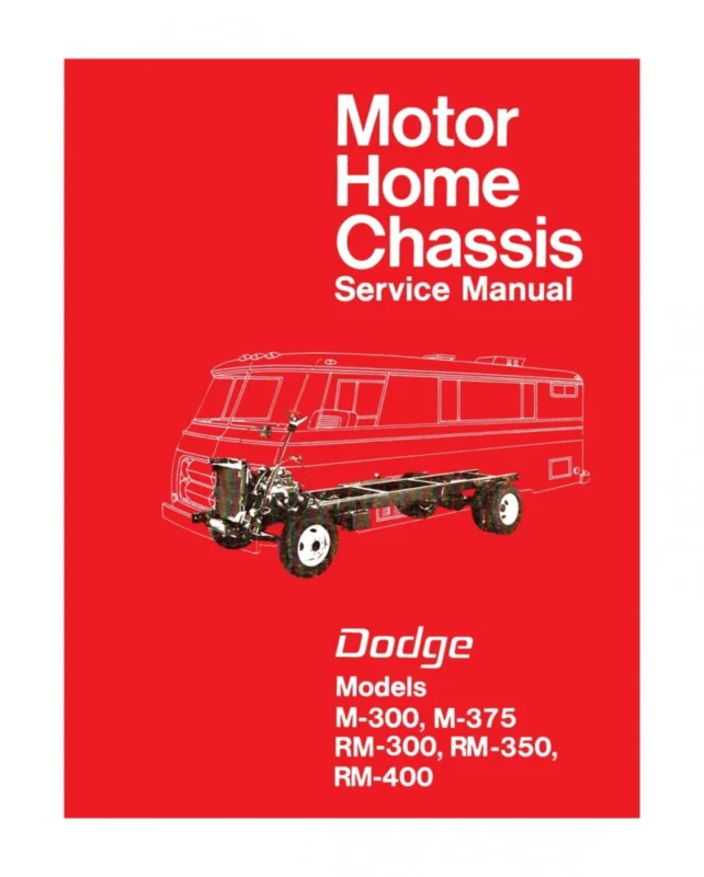 1971-1972 Dodge Motor Home Chassis Service Manual.\\u00A0beskrivningar hur man servar och reparerar framvagn, bromsar, transmission,styrning, kylsystem, karaftöverföring, motor, AC, avgas med mera. Antal sidor 418 Författare Dodge Division Dodge M300, M375\\u00A01