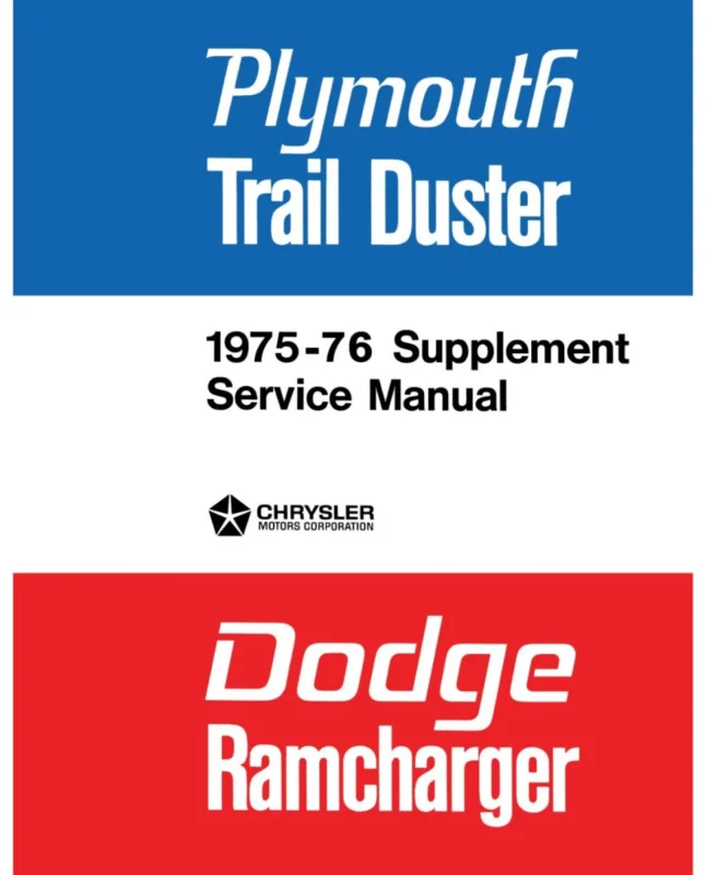 1975-1976 Plymouth Trail Duster & Dodge Ramcharger Service Manual Supplement\\u00A0innehåller beskrivningar hur man servar och reparerar framvagn, bromsar, transmission,styrning, kylsystem, karaftöverföring, motor, AC, avgas med mera. Antal sidor 616 Författa